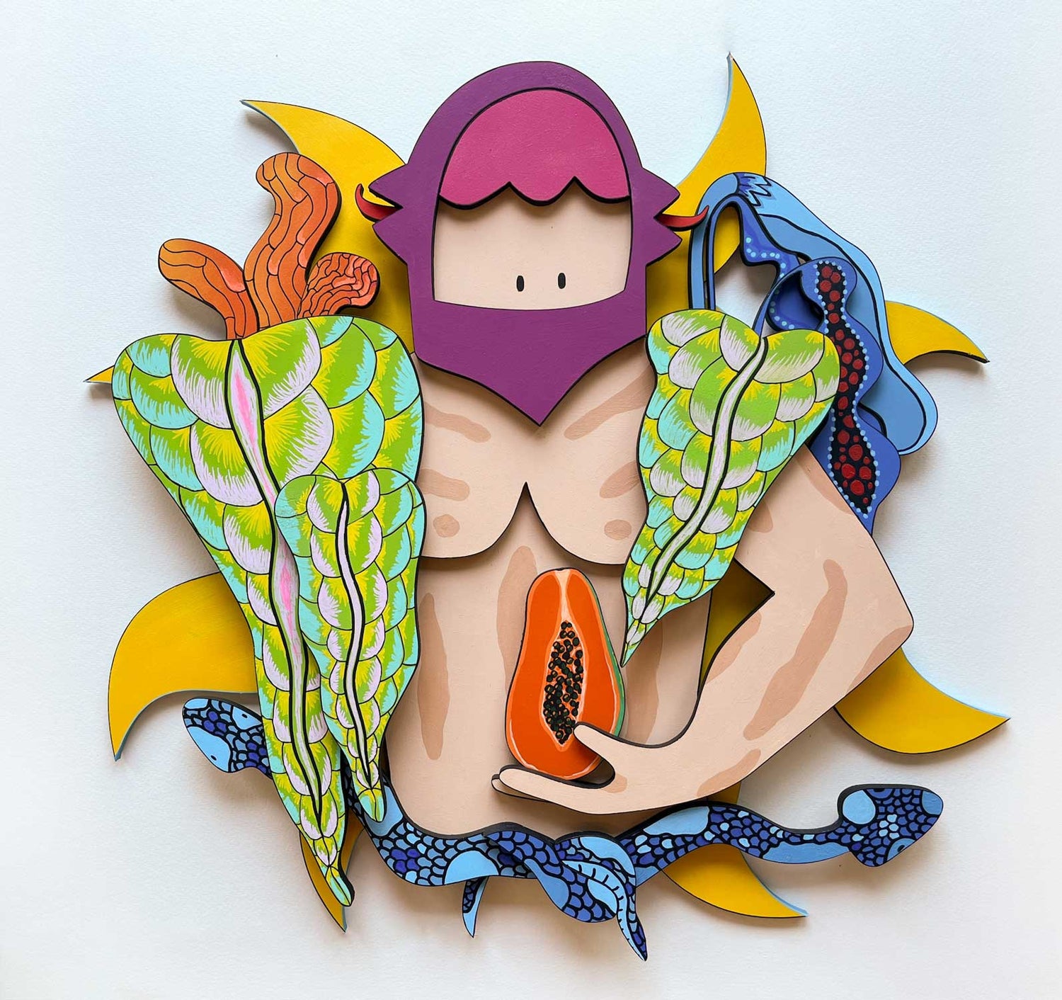 In “Unum sumus” we see the connection between humans and nature, what it means to belong to the natural world. Plenus, the character, is in symbiosis with its rich environment, mutating to adapt to it. An environment with lush vegetation and everything anyone can need. Within the artwork there are symbols of life, growth, resilience, rebirth and wisdom.
